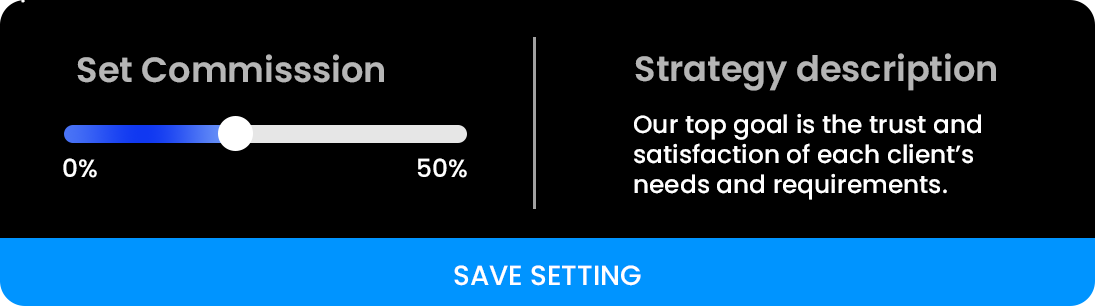 Go to your Master Area, view Settings, adjust the commission using the slider, and save changes. The new commission will only be applied to the Copiers who subscribed to you after the adjustment. For all other Copiers, the commission amount will remain unchanged.